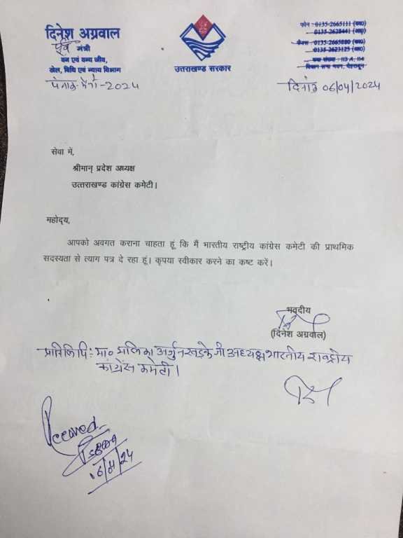 उत्तराखंड कांग्रेस से आज की बड़ी खबर पूर्व कैबिनेट मंत्री दिनेश अग्रवाल ने कांग्रेस का दामन छोड़ा पार्टी से दें दिया इस्तीफा दिनेश अग्रवाल ने अपने लेटर पेड पर कांग्रेस अध्यक्ष को पत्र लिखते हुए  कहा कि वह अपनी प्राथमिक सदस्यता से इस्तीफा दे रहे हैं उसको स्वीकार करने का कष्ट करें
