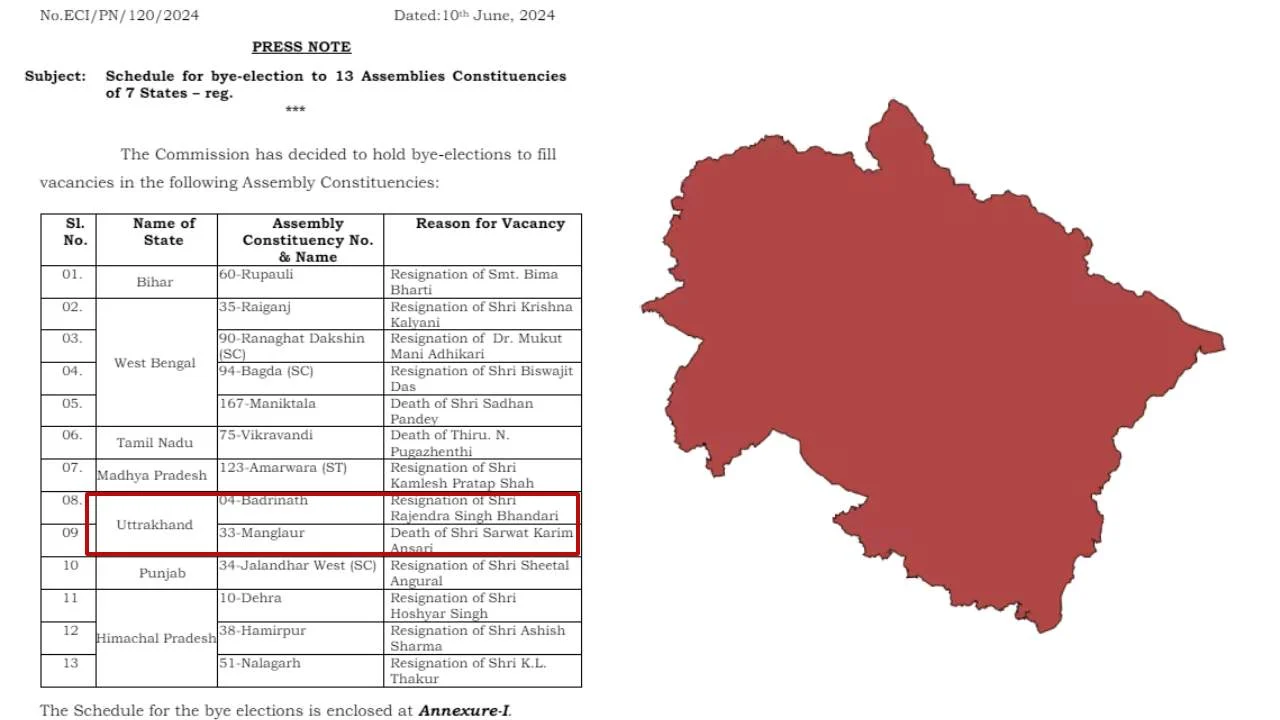 चुनाव आयोग ने 7 राज्यों की 13 विधानसभा सीटों के लिए उपचुनाव का ऐलान किया है। इनमें मंगलौर औऱ बदरीनाथ भा शामिल हैं। मंगलौर विधायक रहे सरवत करीम अंसारी के निधन के कारण ये सीट रिक्त हो गई थी। जबकि बदरीनाथ विधायक राजेंद्र भंडारी ने पाला बदल लिया था जिस वजह से यहां उपचुनाव होने हैं। ऐसे में प्रदेश में खाली दो विधानसभा सीटों पर उपचुनाव कराए जाने को लेकर भारतीय निर्वाचन आयोग ने 10 जून को अधिसूचना जारी कर दी है