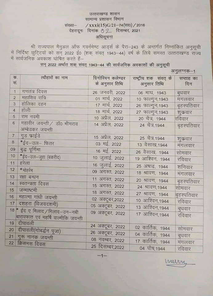 उत्तराखंड शासन ने अगले साल 2022 के लिए सार्वजनिक अवकाशों की सूची जारी कर दी है। शासन की ओर से जारी