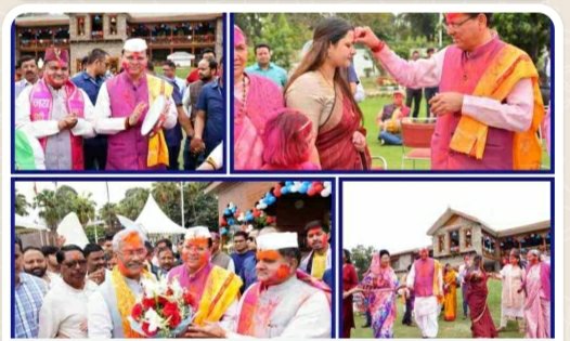 मुख्यमंत्री आवास परिसर में रंगों के पर्व होली की धूम मुख्यमंत्री ने सभी को अबीर-ग़ुलाल लगाते हुए होली की दी शुभकामनायें मुख्यमंत्री पुष्कर सिंह धामी, रविवार को मुख्यमंत्री आवास परिसर में आयोजित होली मिलन कार्यक्रम में शामिल हुए। मुख्यमंत्री ने सभी को अबीर – ग़ुलाल लगाते हुए रंगों के पर्व होली की बधाई व शुभकामनाएं दी होली मिलन कार्यक्रम में शामिल हुए लोगों ने भी मुख्यमंत्री को होली की शुभकामनाएं दी तथा होली से सम्बंधित पारम्परिक गीत श्याम मुरारी के दर्शन को जब विप्र सुदामा आए हरि, आयो वसंत बहार, शिव शंकर खेले होली, फागुन में खेला होली, शिव के मन माहि बसे काशी, आदि खड़ी होली के गीत गाते हुए ढ़ोल – दमाऊ के बीच एक -दूसरे को बधाई दी इस उल्लास भरे उत्सव के अवसर पर सांसद माला राज्य लक्ष्मी शाह, पूर्व मुख्यमंत्री त्रिवेंद्र सिंह रावत, भाजपा प्रदेश अध्यक्ष महेन्द्र भट्ट, एवं अन्य लोग उपस्थित रहे