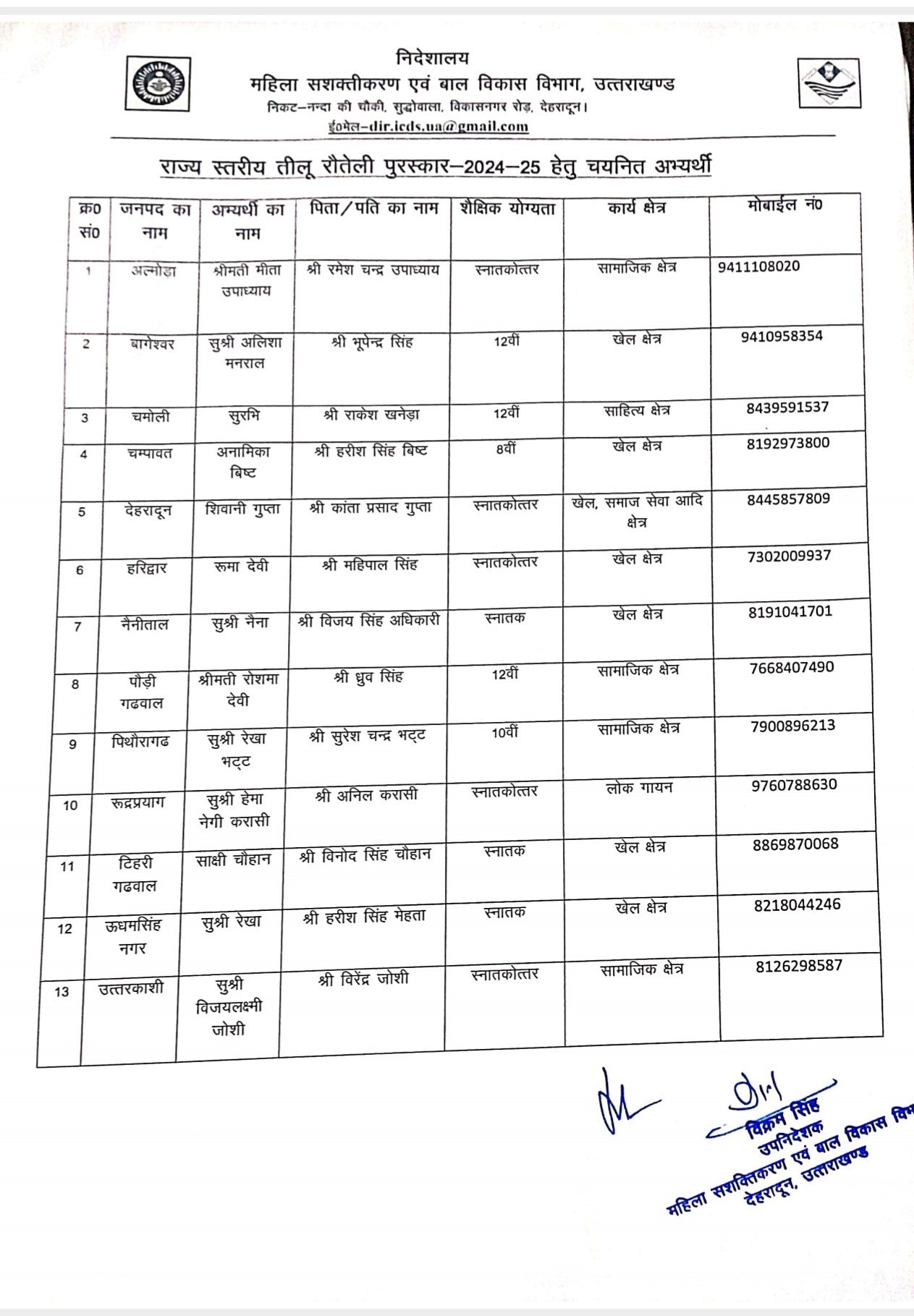 महिला सशक्तिकरण एवं बाल विकास मंत्री रेखा आर्या ने बताया कि तीलू रौतेली पुरस्कार के लिए इस साल प्रदेश भर से कुल मिलाकर 13 महिलाओं का चयन किया गया है। इसके अलावा 33 महिलाओं को राज्य स्तरीय आंगनबाड़ी कार्यकत्रियों का पुरस्कार दिया जाएगा।