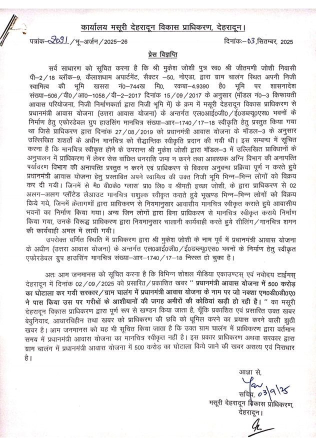 एमडीडीए ने साफ किया कि मुकेश जोशी का प्रधानमंत्री आवास योजना के लिए स्वीकृत किया गया नक्शा पहले ही रद्द हो चुका है और वर्तमान में ग्राम चालंग में इस योजना का कोई नक्शा स्वीकृत नहीं है। इसलिए, 500 करोड़ रुपये के घोटाले की खबर पूरी तरह से गलत और निराधार है।