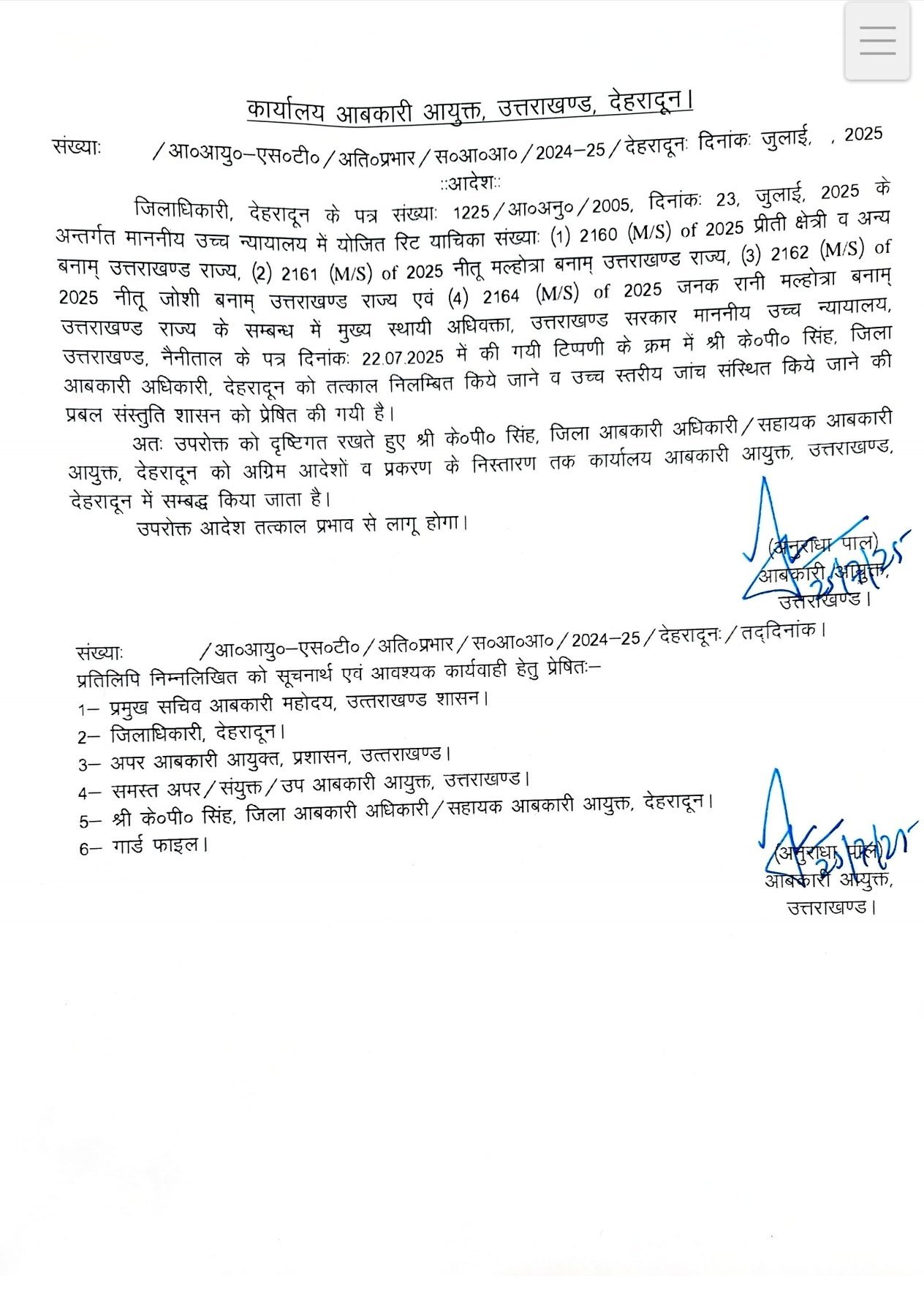 आबकारी आयुक्त अनुराधा पाल ने शासन से जिला आबकारी अधिकारी केपी सिंह के निलंबन एवं उच्च स्तरीय जांच की संस्तुति की है। उन्हें अग्रिम आदेशों तक आबकारी आयुक्त कार्यालय से भी अटैच कर दिया गया है। यह संस्तुति देहरादून में शराब की दुकानों की शिफ्टिंग को लेकर की गई ढिलाई, झूठे तथ्य और अधिकारियों को गुमराह करने के गंभीर आरोपों के चलते की गई है।