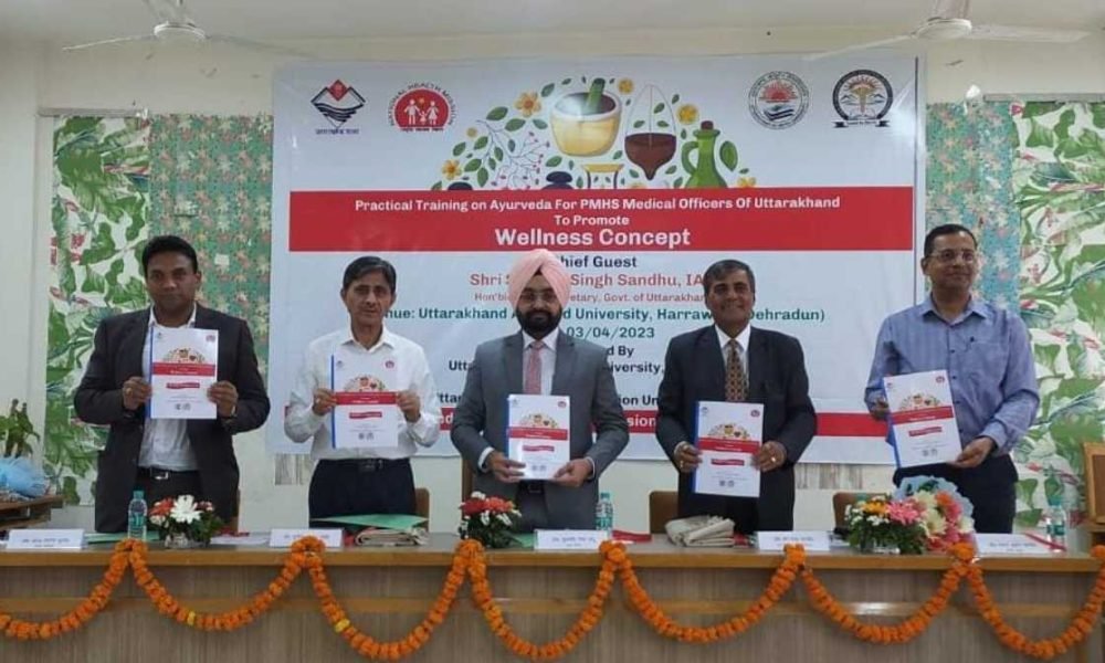 मुख्य सचिव द्वारा प्रषिक्षण कार्यक्रम में Practical Training on Ayurveda For PMHS Medical Officers of Uttarakhand To Promote Wellness Concept उत्तराखण्ड आयुर्वेद विश्वविद्यालय तथा एच0एन0बी0 उत्तराखण्ड चिकित्सा षिक्षा विश्वविद्यालय द्वारा बनाये गये प्रशिक्षण मोड्यूल का विमोचन किया गया।