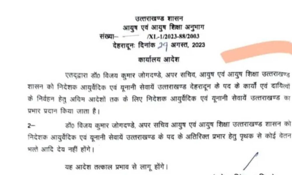 आदेश में आगे लिखा है कि डॉ० विजय कुमार जोगदण्डे को निदेशक आयुर्वेदिक एवं यूनानी सेवायें उत्तराखण्ड के पद के अतिरिक्त प्रभार हेतु पृथक से कोई वेतन भत्ते आदि देय नहीं होंगे। यह आदेश तत्काल प्रभाव से लागू होगा।